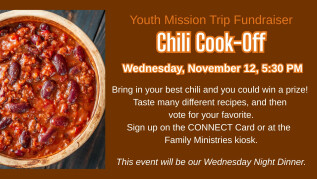 Join us for a delicious family dinner from 5:30 PM to 6:30 PM each Wednesday evening.